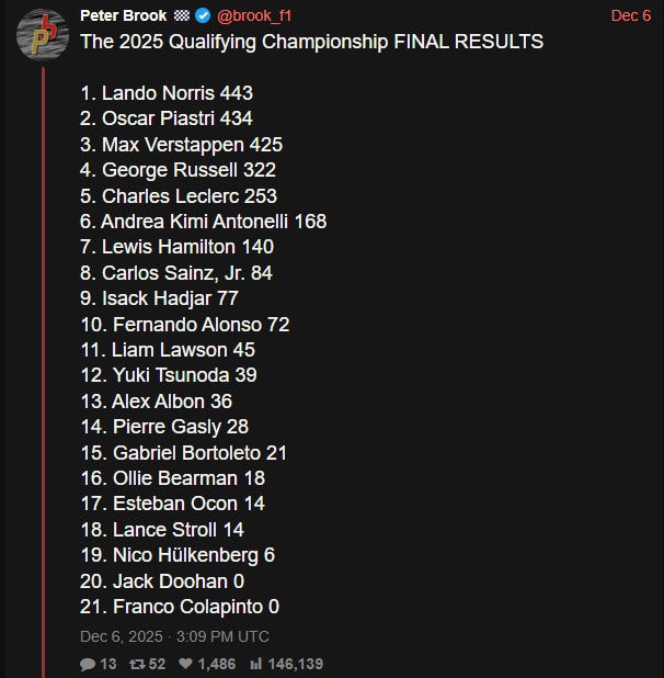 This award treats qualifying as its own championship. A pole earns a driver 25 points, second place 18 points, and so on and so forth. Peter Brook on Twitter has been keeping track of this: